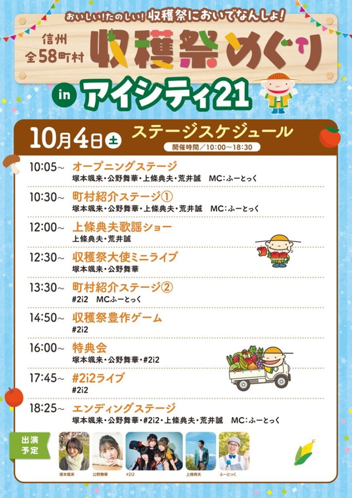 イベントステージには、収穫祭大使の塚本颯来さん、公野舞華さん、アイドルグループの#2i2さん、歌手の上條典夫さんと荒井誠さんがゲストとして出演されます!