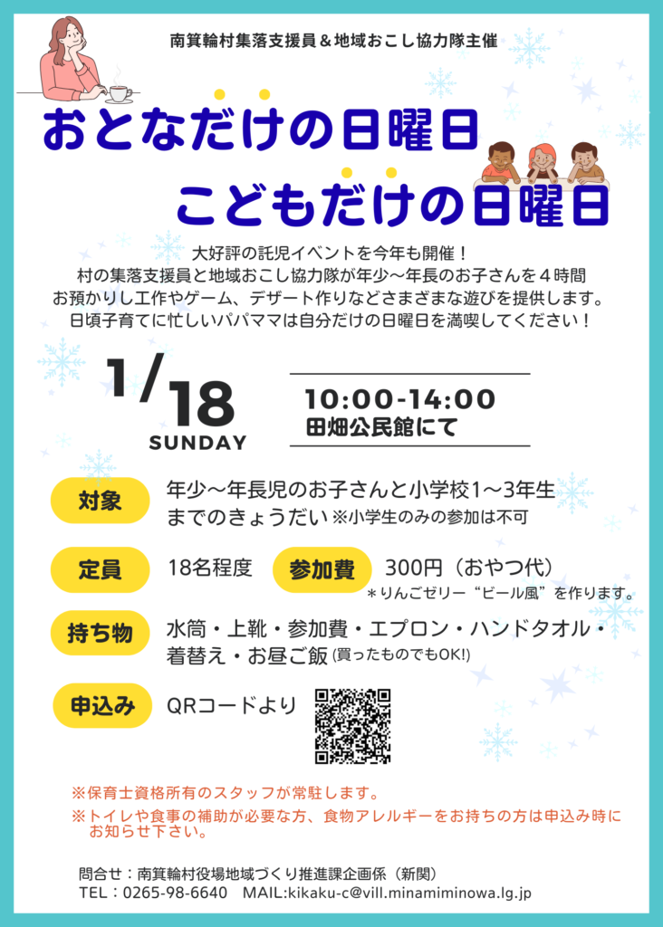 ということで、恒例の子育て応援企画“おとなだけの日曜日・こどだけの日曜日”を開催します!