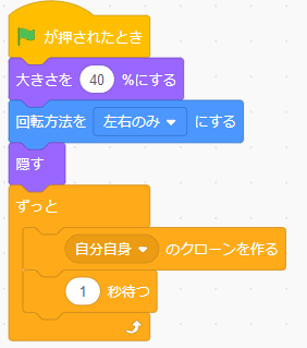あとは弾のプログラムと同じようにずっと10歩動かし端に触れたらクローンを削除するようにプログラムします。