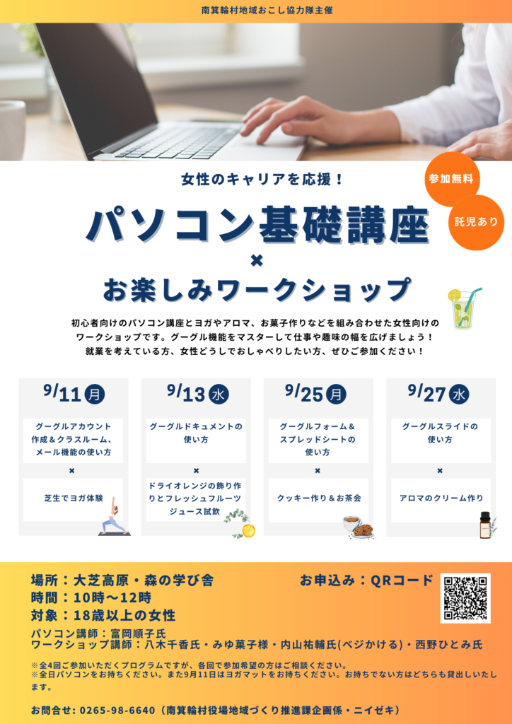 2時間のうち前半はGoogle機能の使い方を学パソコン講座、後半はヨガやアロマ、お菓子作りなどのお楽しみアクティビティをご用意しています。